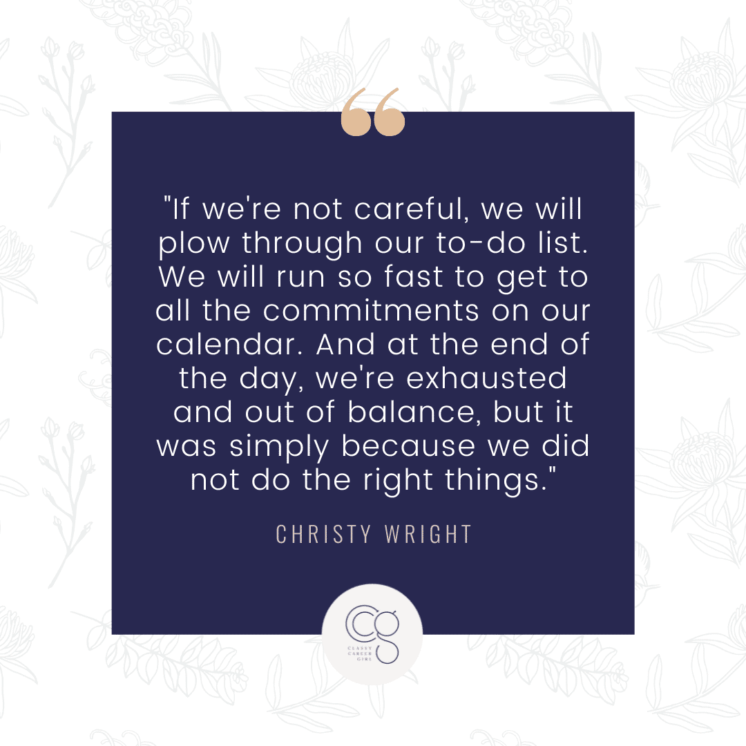 “If we’re not careful, we will plow through our to-do list. We will run so fast to get to all the commitments on our calendar. And at the end of the day, we’re exhausted and out of balance, but it was simply because we did not do the right things.” – Christy Wright